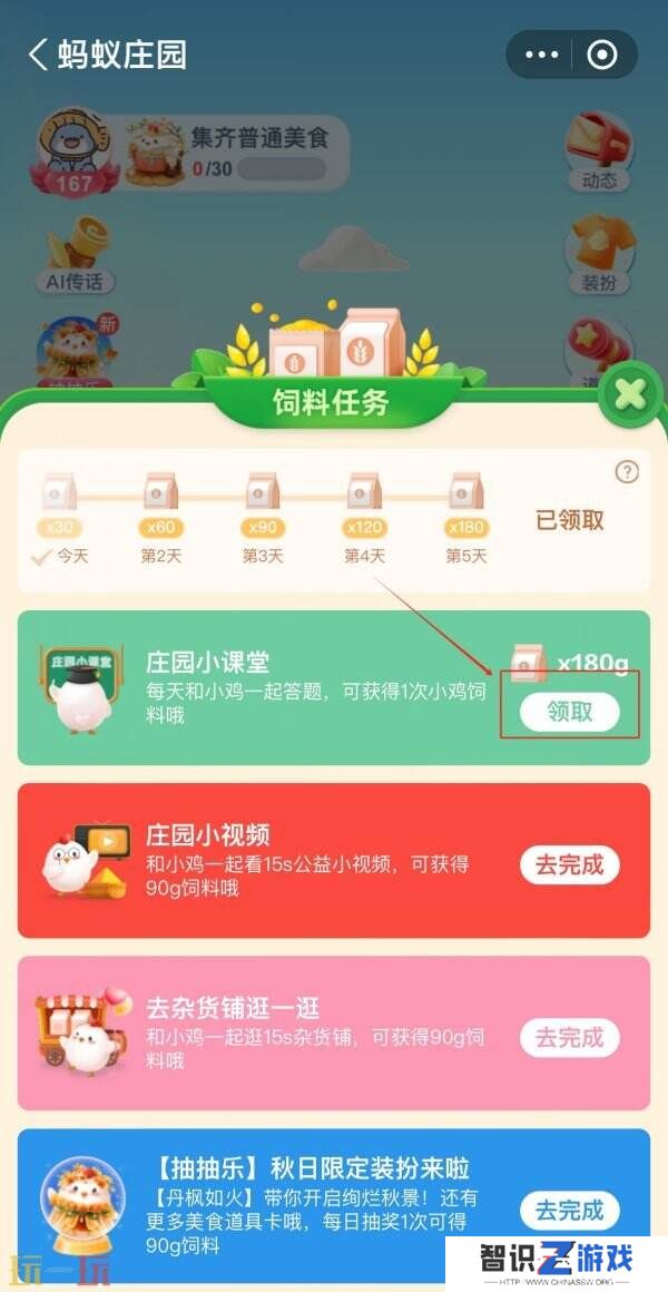 步骤四:每天题库内有两道题,正确回答一题就能获得180g饲料,答错了也能获得30g饲料。