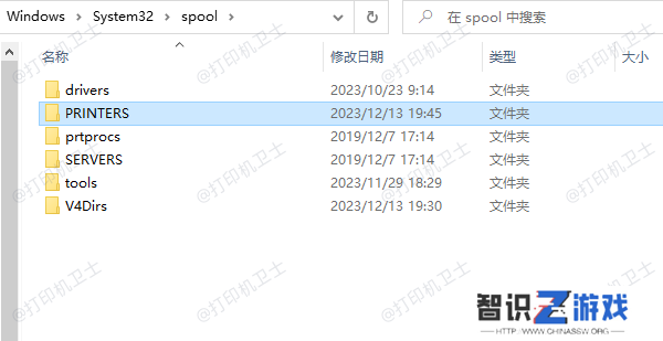 3、打开文件资源管理器,进入 C:WindowsSystem32spoolPRINTERS 文件夹。删除其中的所有文件,这些文件是打印任务缓存。