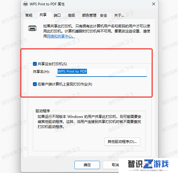 选择目标打印机,点击管理 → 打印机属性 → 共享选项卡,勾选共享此打印机并自定义共享名称。
