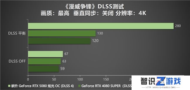 《漫威争锋》是一款多人竞技游戏,在4K最高画质下采用DLSS 4技术的优化后,有着非常出色的性能表现,游戏性能更是实现了进一步飞跃。GeForce RTX 4080 SUPER和GeForce RTX 4080 在DLSS 3平衡模式中分别拥有120帧和130帧,而耕升 GeForce RTX 5080 炫光 OC在DLSS 4平衡模式下,其帧数高达达到了280帧超高水平,较前两代显卡平均增加了115%,提供了非常高的帧率,这将为玩家带来流畅而高品质的游戏体验。