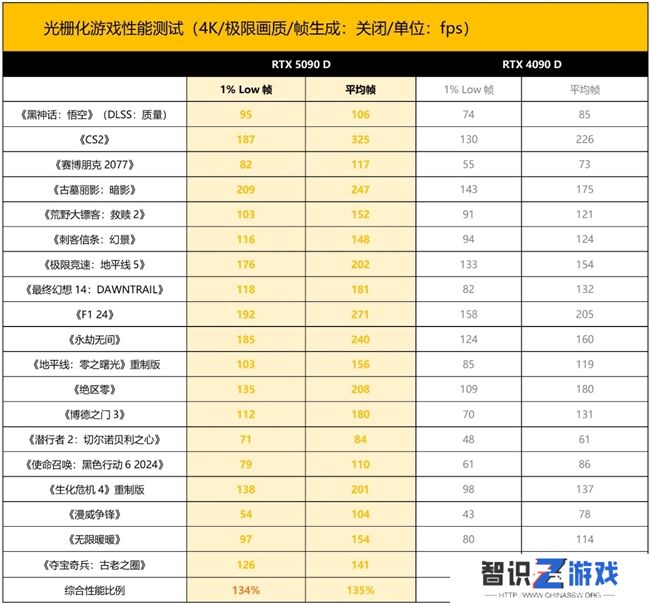 在常规游戏性测试中,在4K极限画质设定下光栅化游戏性能的表现,RTX 5090 D相对RTX 4090 D的平 均帧率提升幅度从24%到59%不等,平均提升幅度大约为34%,其中《赛博朋克2077》《永劫无间》提升幅度都非常惊人,都超过了50%~而在影响游戏流畅度的1% Low帧方面,RTX 5090 D在《博德之门3》中甚至领先了RTX 4090 D大约60%,综合全部游戏平均领先的幅度是35%。