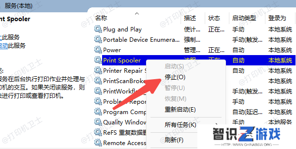 找到“Print Spooler”服务:右键点击,选择“停止”。