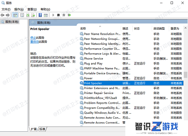 2、在服务列表中找到“Print Spooler”(打印后台处理程序),确保它的状态为“正在运行”。