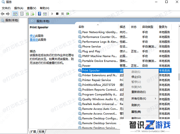 2. 找到“Print Spooler”服务,右键点击并选择“启动”或“重新启动”。